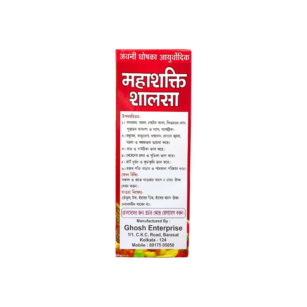 Abani Ghosh Mahashakti Shalsa is help digestion and cleans the bowels. It protects against liver diseaseand gastric. Heart is weak and cures cough, Girls Sutika do well, heartburn, burning in urine, abdominal pain, indigestion, improve digestive function supports the regeneration of liver cells improves immunity for general wellness.