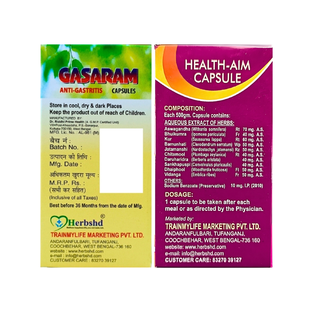 Anti-Gastritis Gasaram Capsule & Health Aim Capsule for acidity relief, constipation relief, heartburn, indigestion, weight gain, increases muscle, body building, improves intelligence, immunity booster