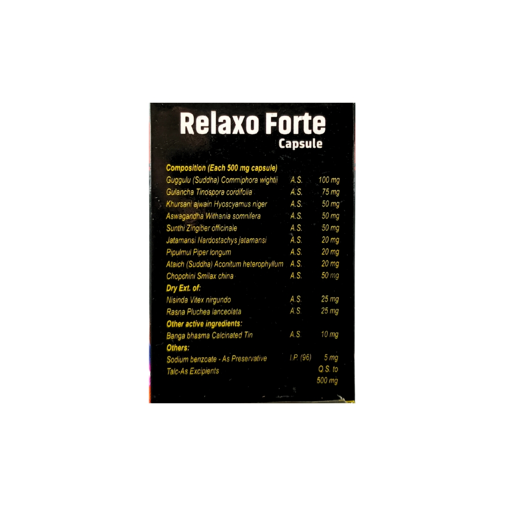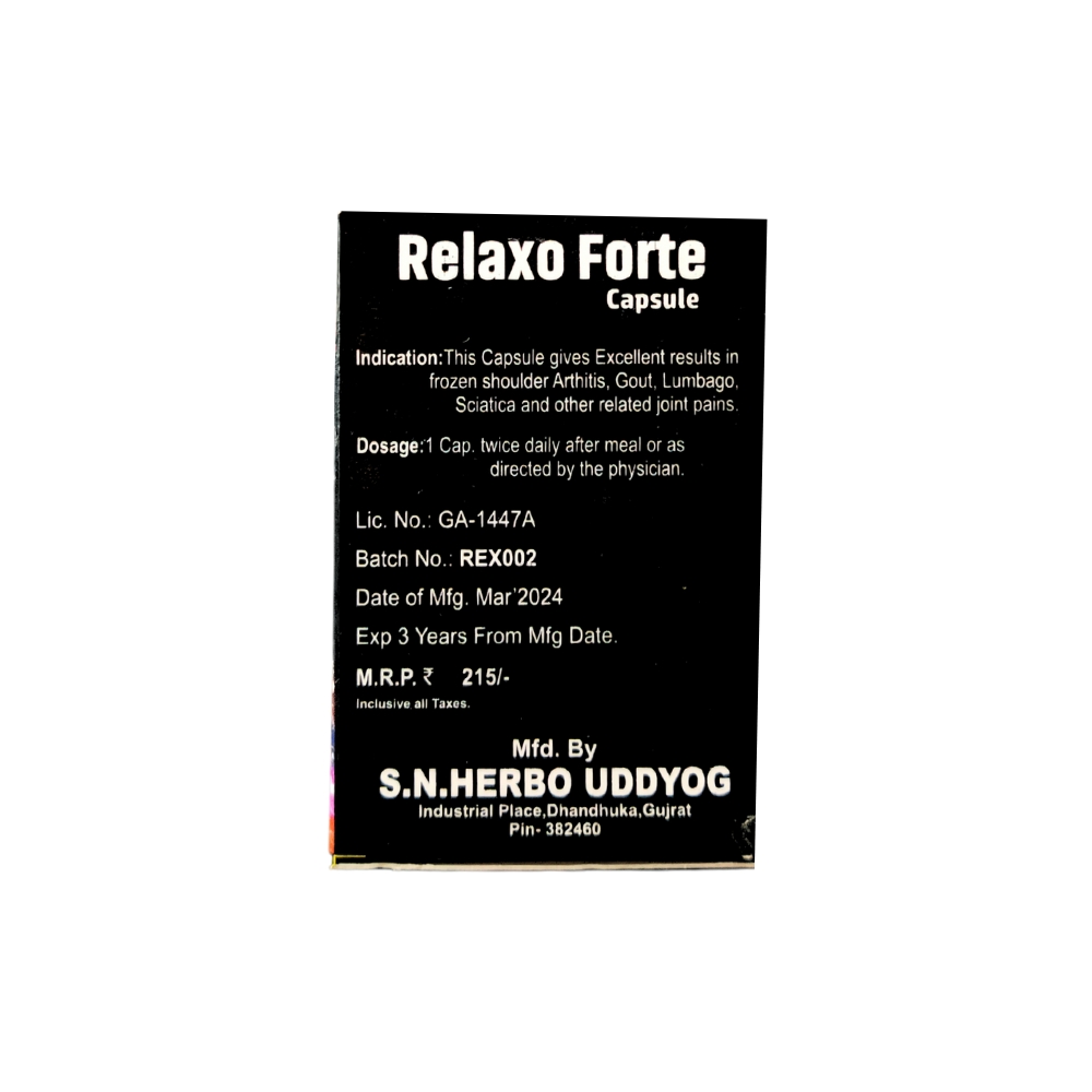 Ayurvedic Joint Pain Relief Relaxo Forte Capsule This capsule gives excellent results in frozen shoulder, arthritis, gout, lumbago, sciatica and other related joint pains. It is a very good pain reliever medicine and this medicine has no side effects. You can eat it throughout the year without hesitation.