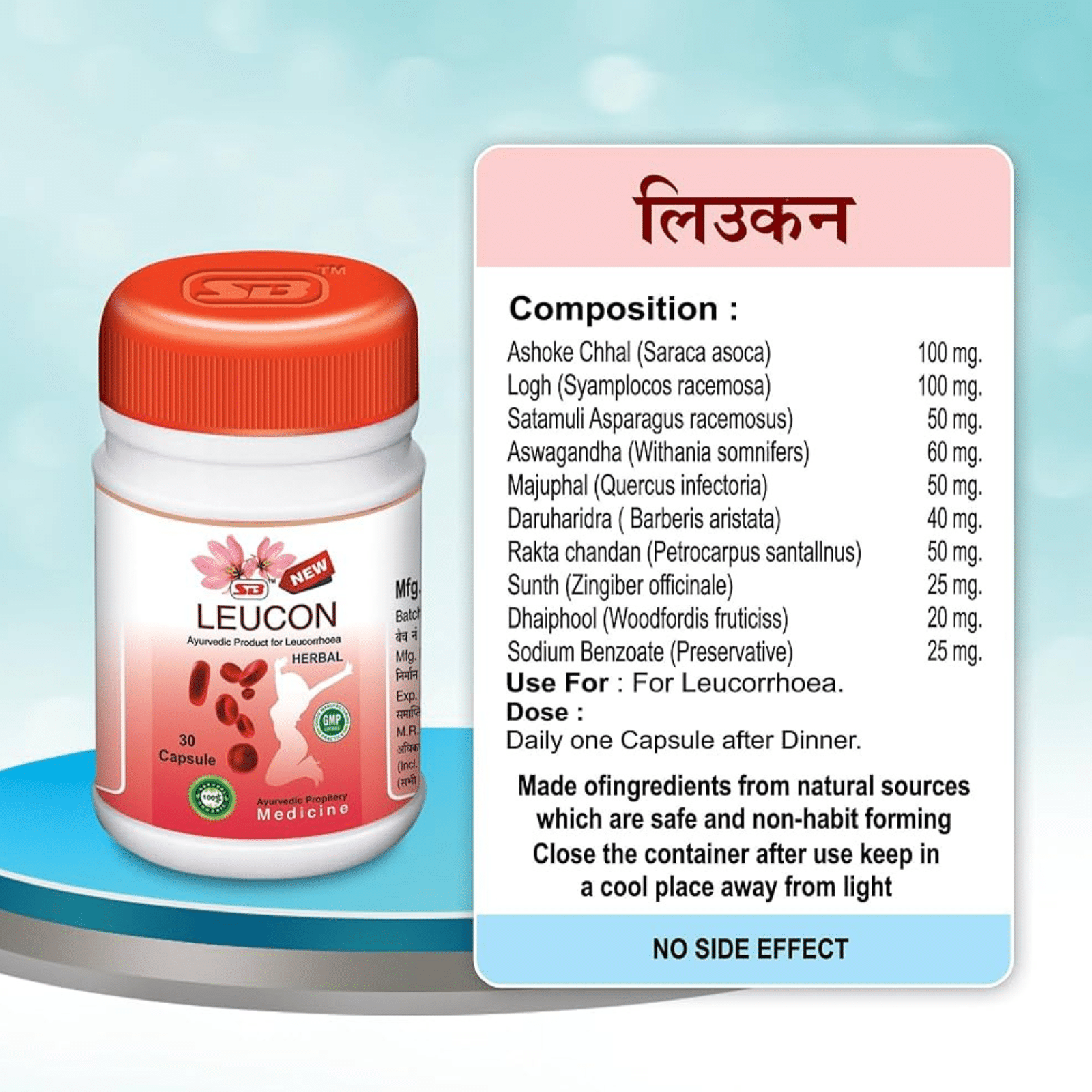 SB Leucon Herbal Capsules is an Ayurvedic supplement with a blend of three herbs that aid in the management of leucorrhoea. Asparagus racemosus, also known as shatavari, is a powerful Ayurvedic rejuvenator commonly used in women’s health to support menstruation and the reproductive system. Symplocos Racemosa, is an astringent medicinal plant commonly used in Ayurvedic formulations for various women’s health conditions including leucorrhoea. heavy menstrual bleeding, and cramps.