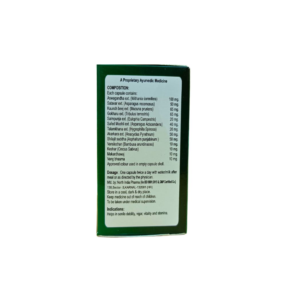 Helps in senile debiliy, vigor, vitality and stamina, Physical dysfunction like Premature Ejaculation and Dysfunction loss of Libido and for Vigor And Vitality In Male.