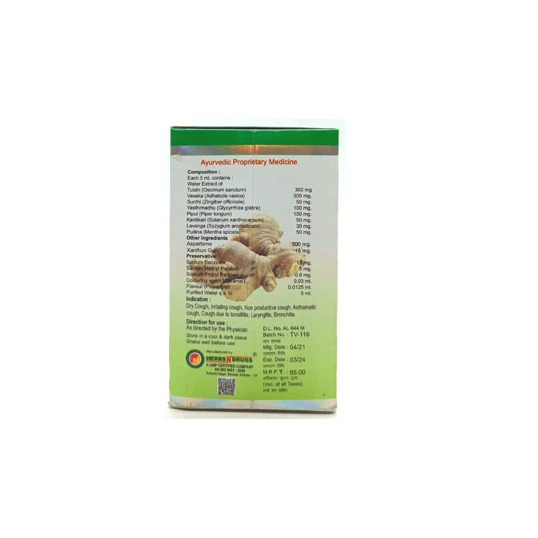 Each 5 ml Syrup: Tulsi 450 mg, Vasak 350 mg, Yastimadhu 200 mg, Zinger 100 mg, Pudina 70 mg, Kantikari 100 mg, Lavanga 5 mg, Pippali 75 mg, Additives: Sugar 2 gm, Xanthun gum 15 mg, Preservative: Sodium Benzoate IP 17 mg, Sodium Methyl Paraben IP 5 mg, Sodium Propyl Paraben IP 0.8 mg, Colour: Caramel 0.03 ml, Flavour: Mixed fruit 0.0125 ml, Purified water q.s to 5 ml.
