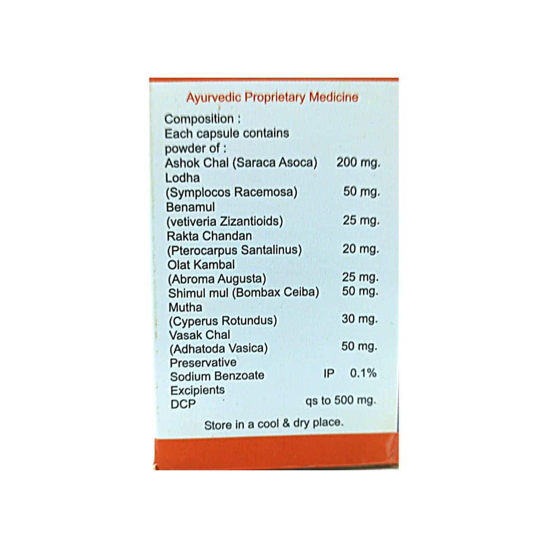 Each Capsule Contains Powder of: Ashok Chal 200 mg, Lodha 50 mg, Benamul 25 mg, Rakta Chandan 20 mg, Olat Kambal 25 mg, Simul mul 50 mg, Mutha 30 mg, Vasak Chal 50 mg.