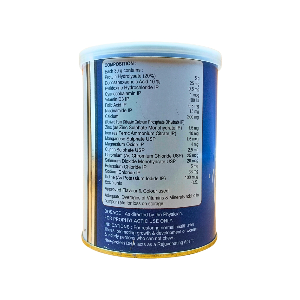 - For restoring normal health after illness, promoting growth & development of women & elderly persons who can not chew Neu-protein DHA acts as a Rejuvenating Agent